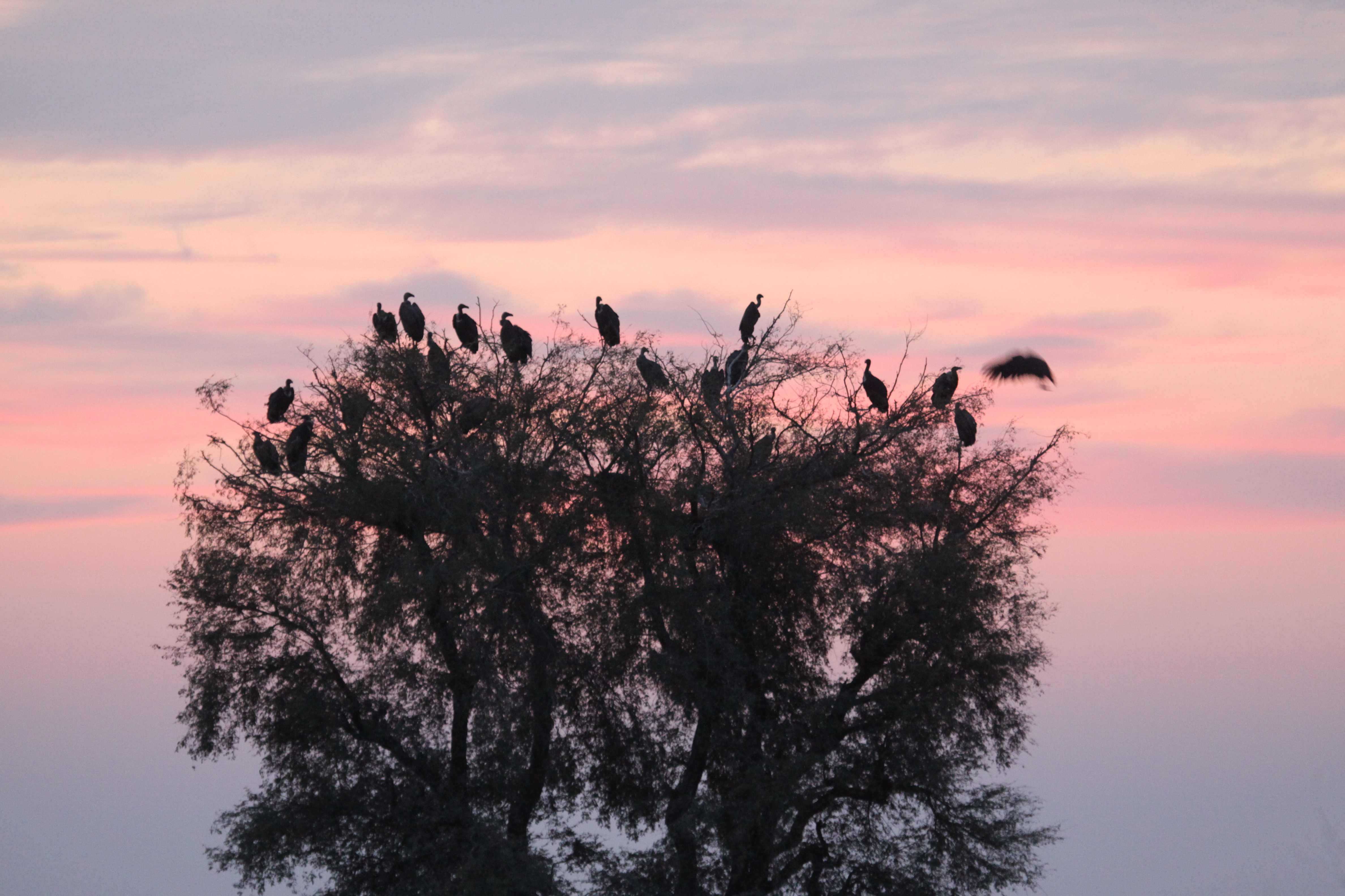 Just as we entered this area of the Park, we were rewarded by a rare sight: over a dozen white-backed vultures spread over a cluster of three trees. This number doubled in the evening as they flocked together for roosting in the night. A heartening sight because vultures of all species are disappearing at an alarming rate all over India. The forest guard Balveer Singh informed that this large scale decimation is due to a veterinary drug called Diclofenac that's used to treat cattle. This drug enters the body of vultures who feed on the carcasses of cattle, and that kills them instantly.